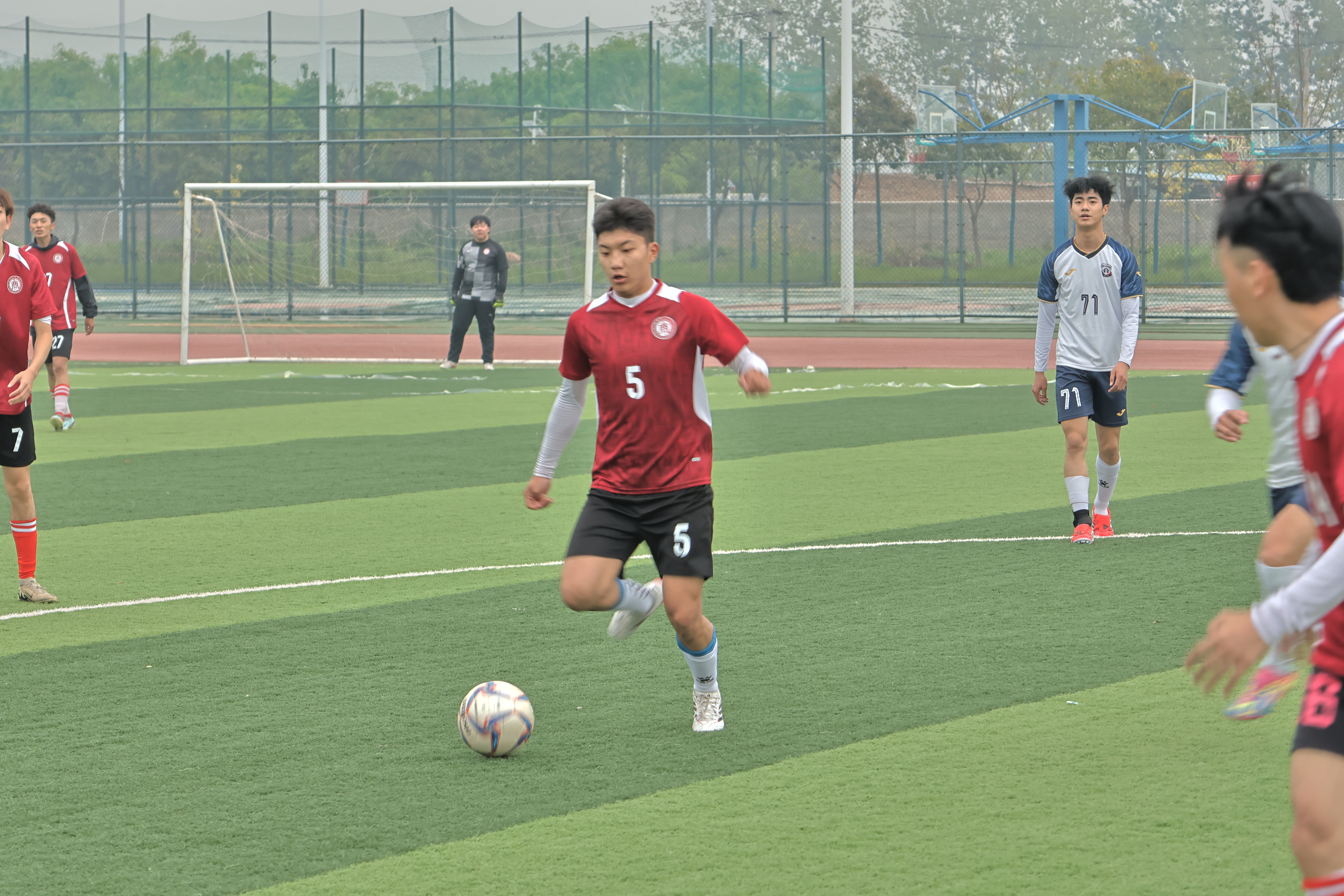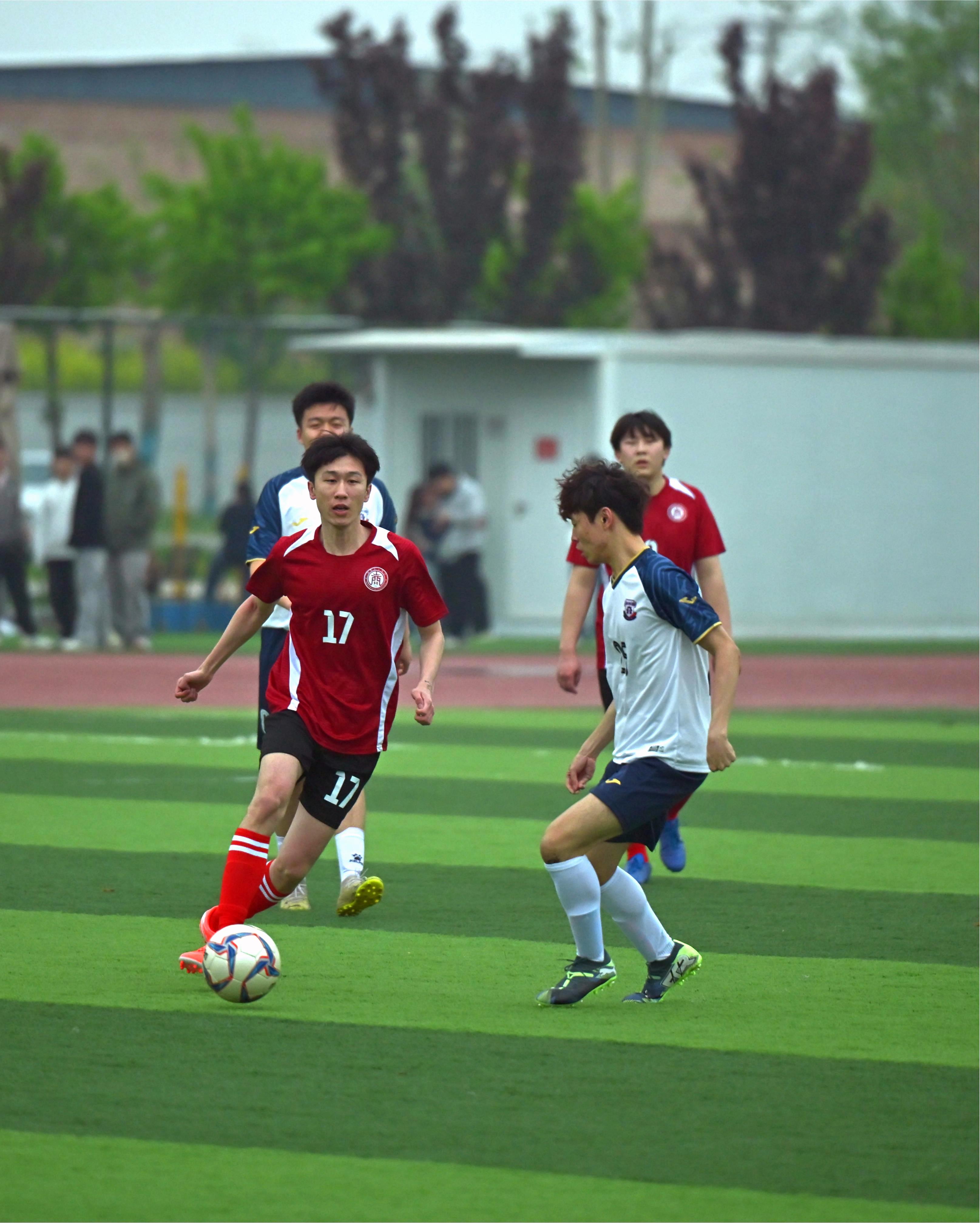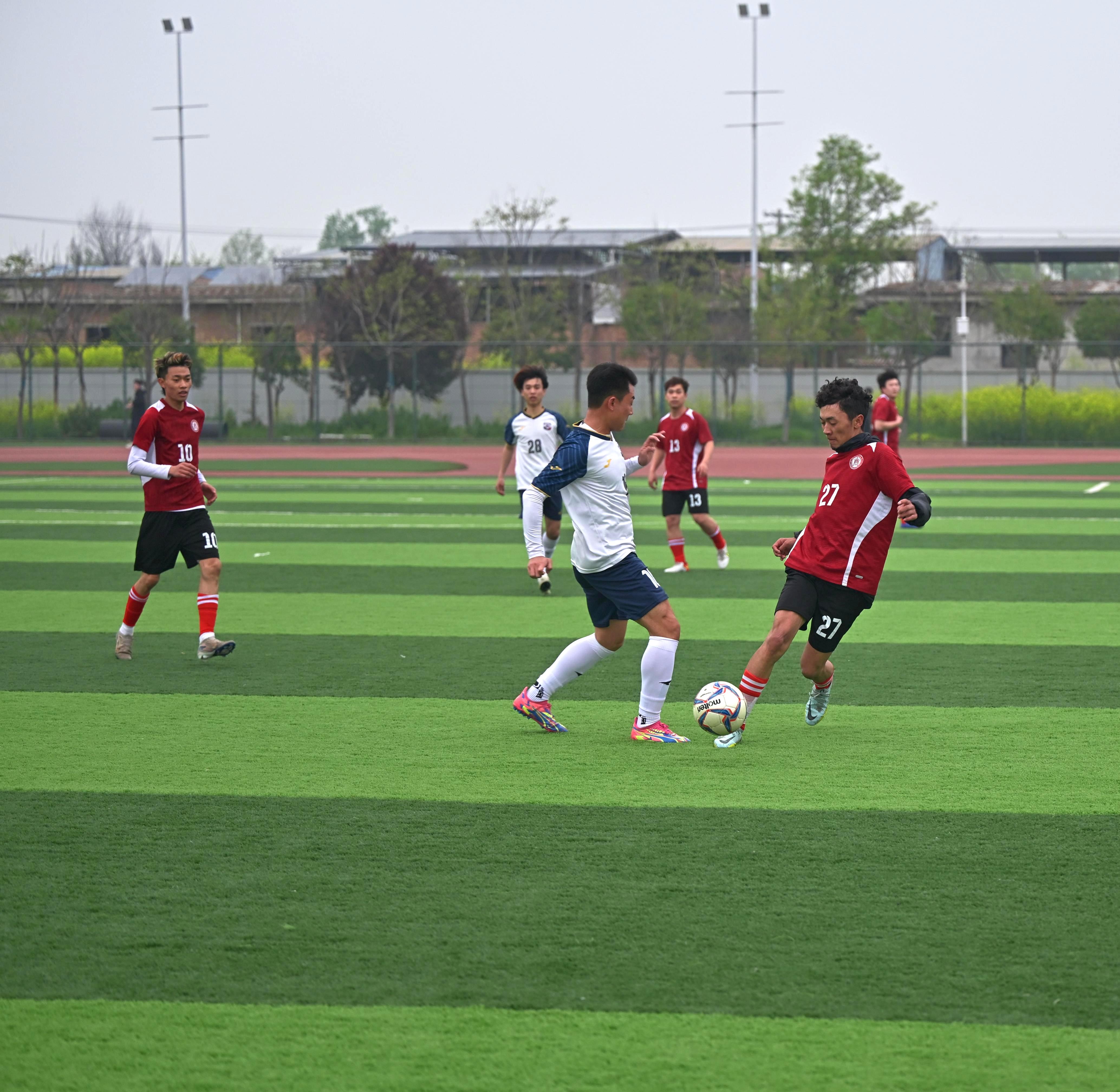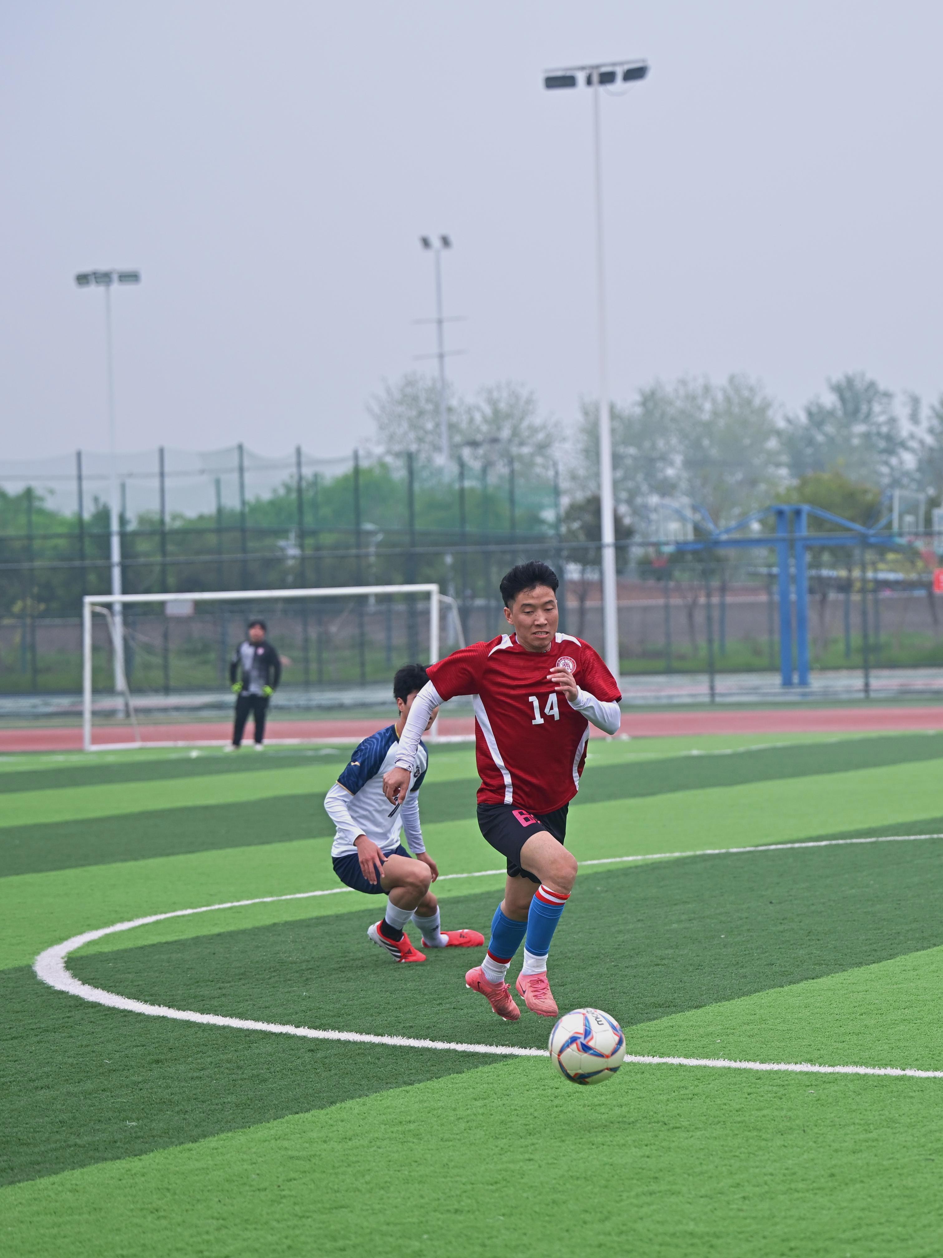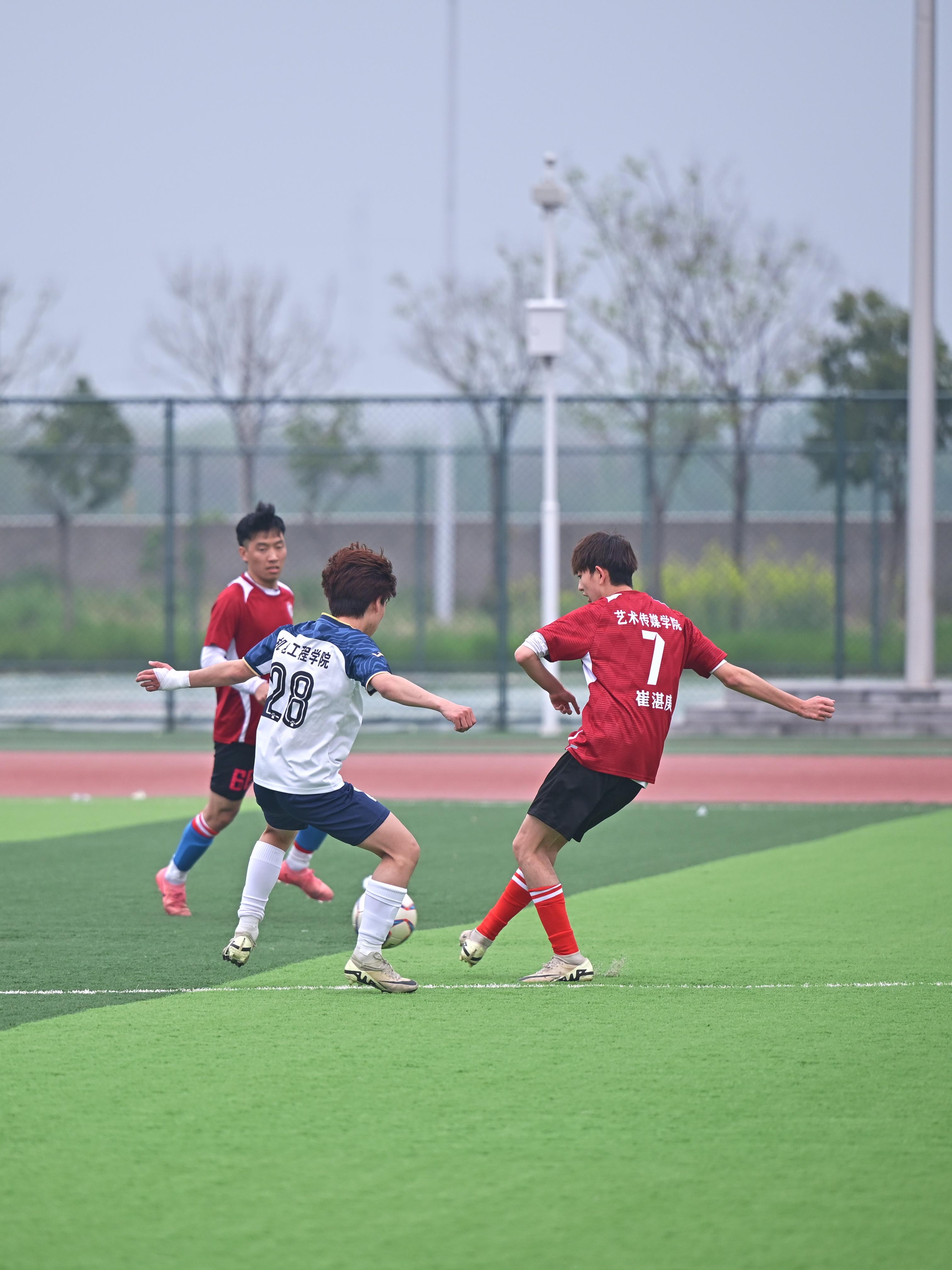 17时50分,随着裁判员一声哨响,艺术与传媒学院与机电工程学院的对决正式打响。艺传学院队员传球精准、跑位灵活,攻防转换节奏明快,展现出日常训练积淀的默契配合。队伍依托稳固防守伺机反击,与对手在中场展开激烈角逐,雨中对抗更显坚韧拼搏。
